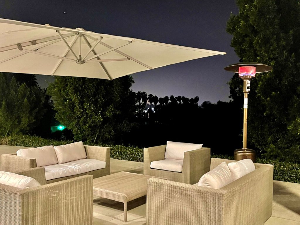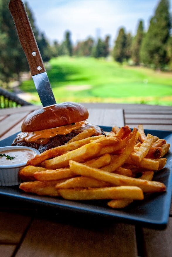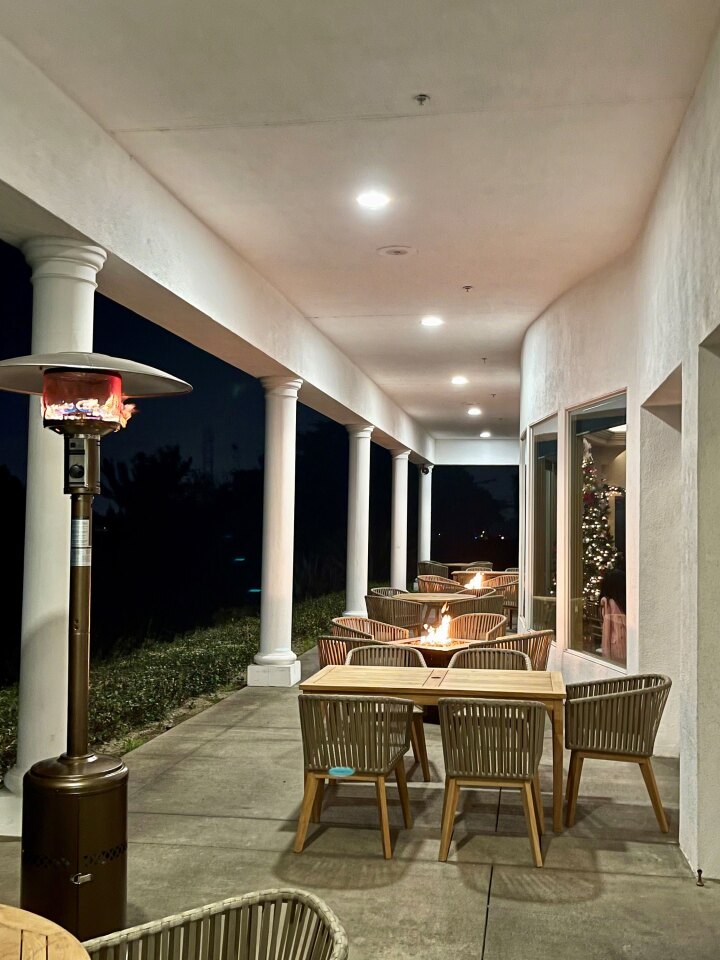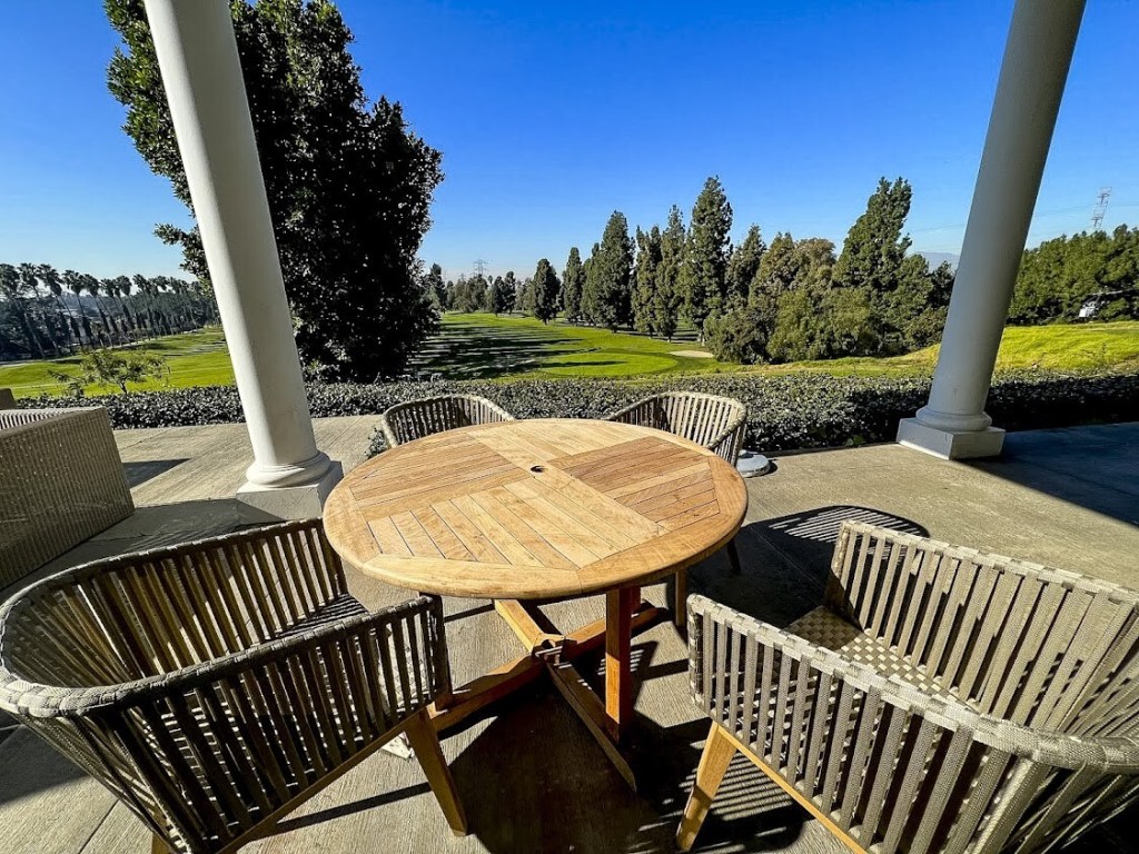 Our outside patio dining option includes our new patio furniture and umbrella to provide shade in the heat. We have dazzling firepits and patio heaters to keep you warm in the cold. The natural teak wood tables blend perfectly into the California Country Club landscape.