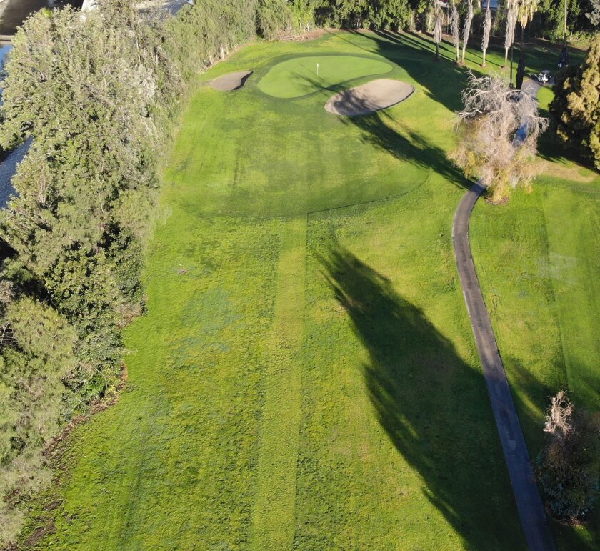 Dog-leg left with 3 fairway bunker’s. A well struck tee shot into the wind gives you a great chance to get on in two. Otherwise, a well-played second shot will allow for a short iron onto a large green with a back to front slope.